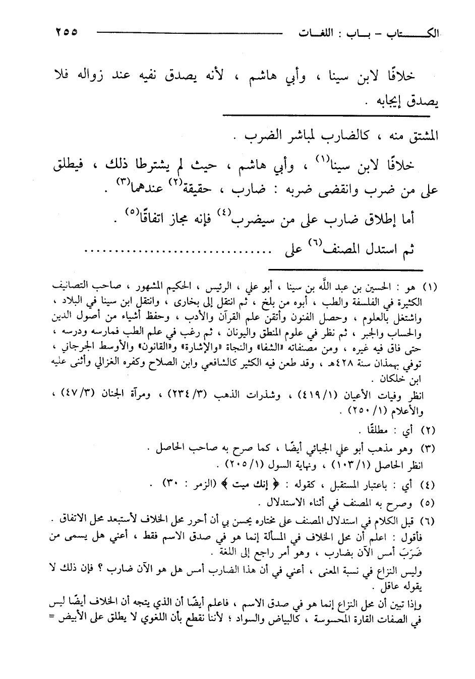 خلافًا لابن سينا، وأبي هاشم، حيث لم يشترطا ذلك، فيطلق على من ضرب وانقضى ضربه: ضارب، حقيقة عندهما.
