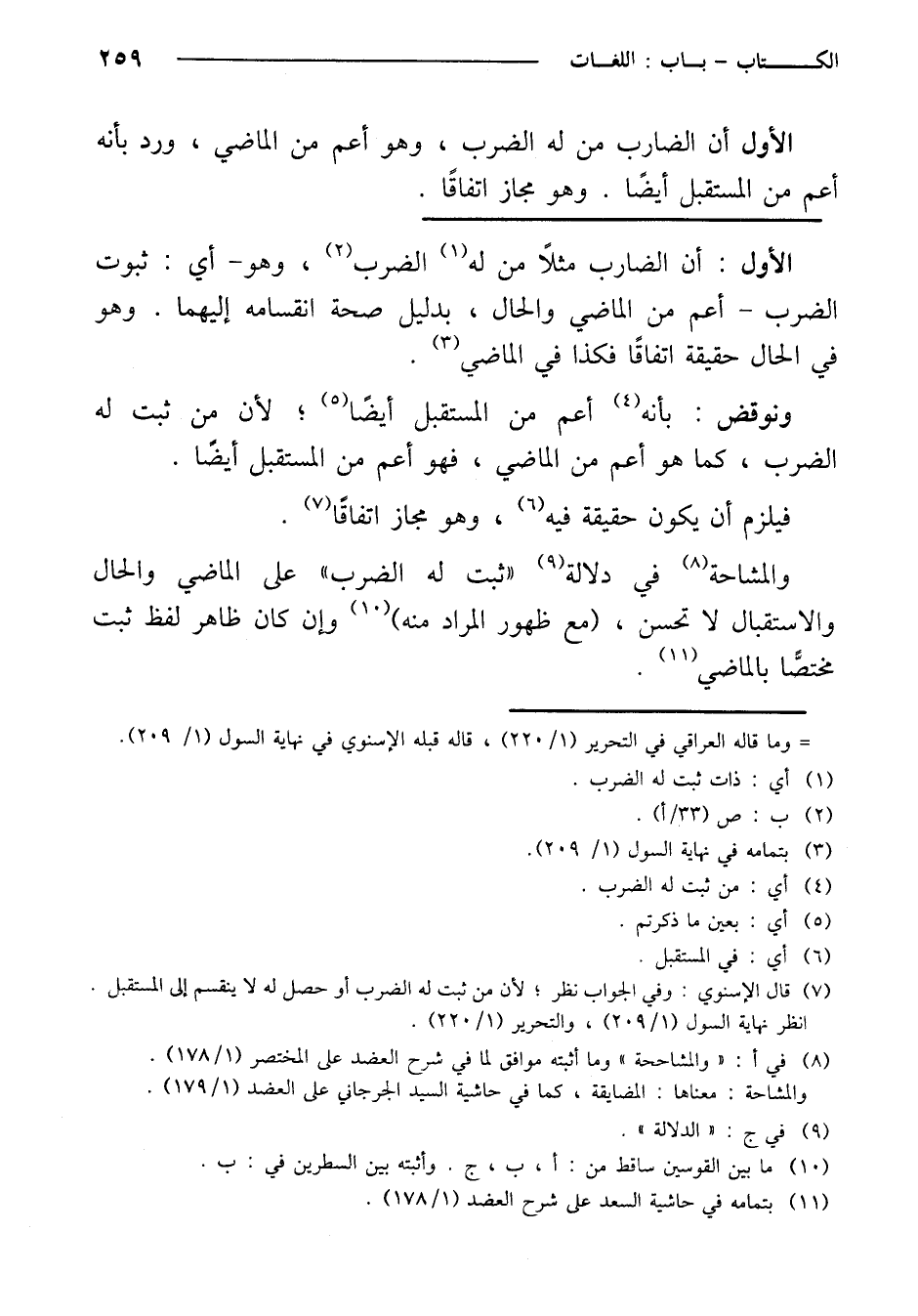 الأول: أن الضارب مثلًا من له الضرب، وهو - أي: ثبوت الضرب - أعم من الماضي والحال، بدليل صحة انقسامه إليهما. وهو في الحال حقيقة اتفاقًا فكذا في الماضي.