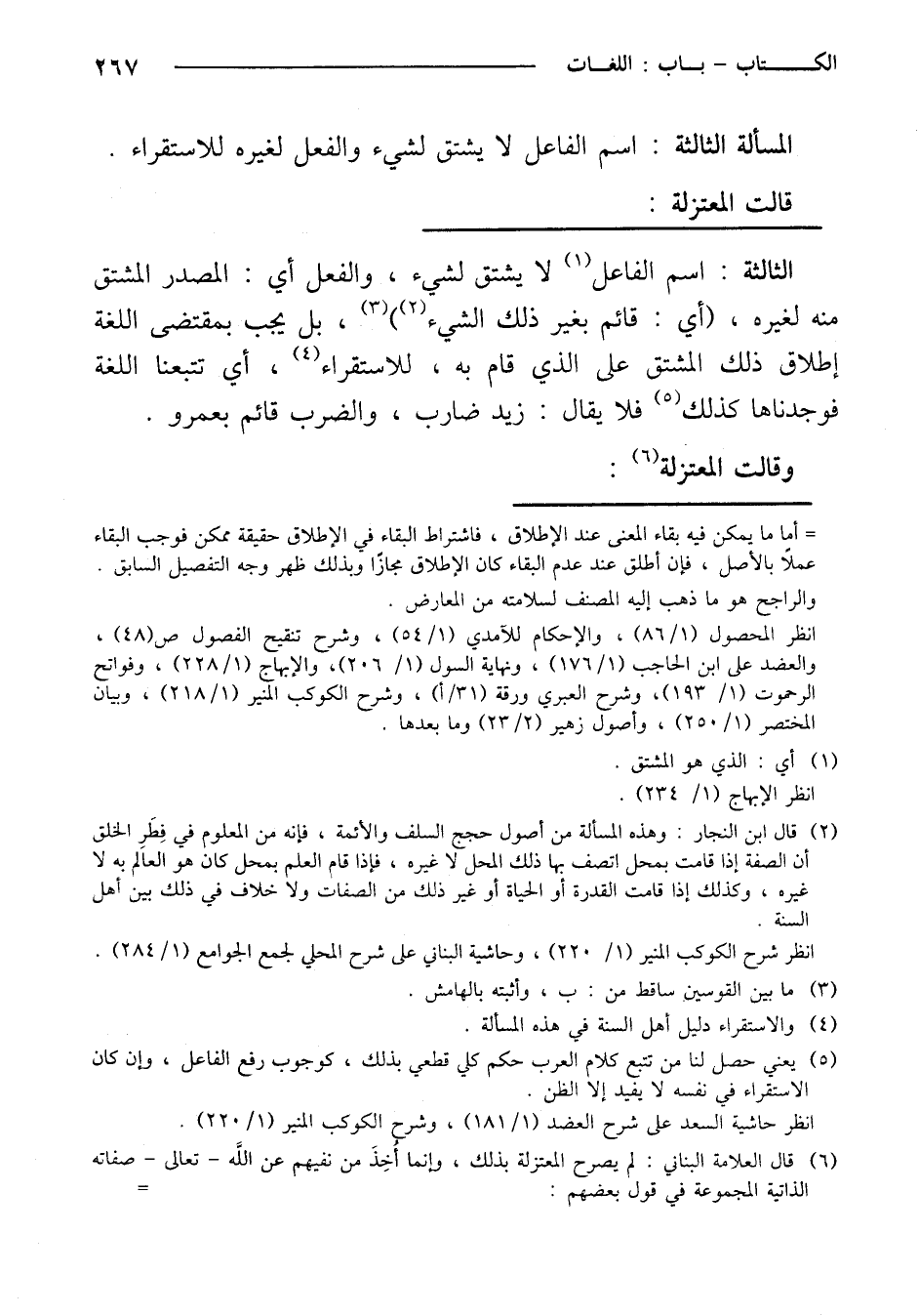 الثالثة: اسم الفاعل لا يشتق لشيء، والفعل أي: المصدر المشتق منه لغيره، (أي: قائم بغير ذلك الشي)، بل يجب بمقتضى اللغة إطلاق ذلك المشتق على الذي قام به، للاستقراء، أي تتبعًا اللغة فوجدناها كذلك فلا يقال: زيد ضارب، والضرب قائم بعمرو.