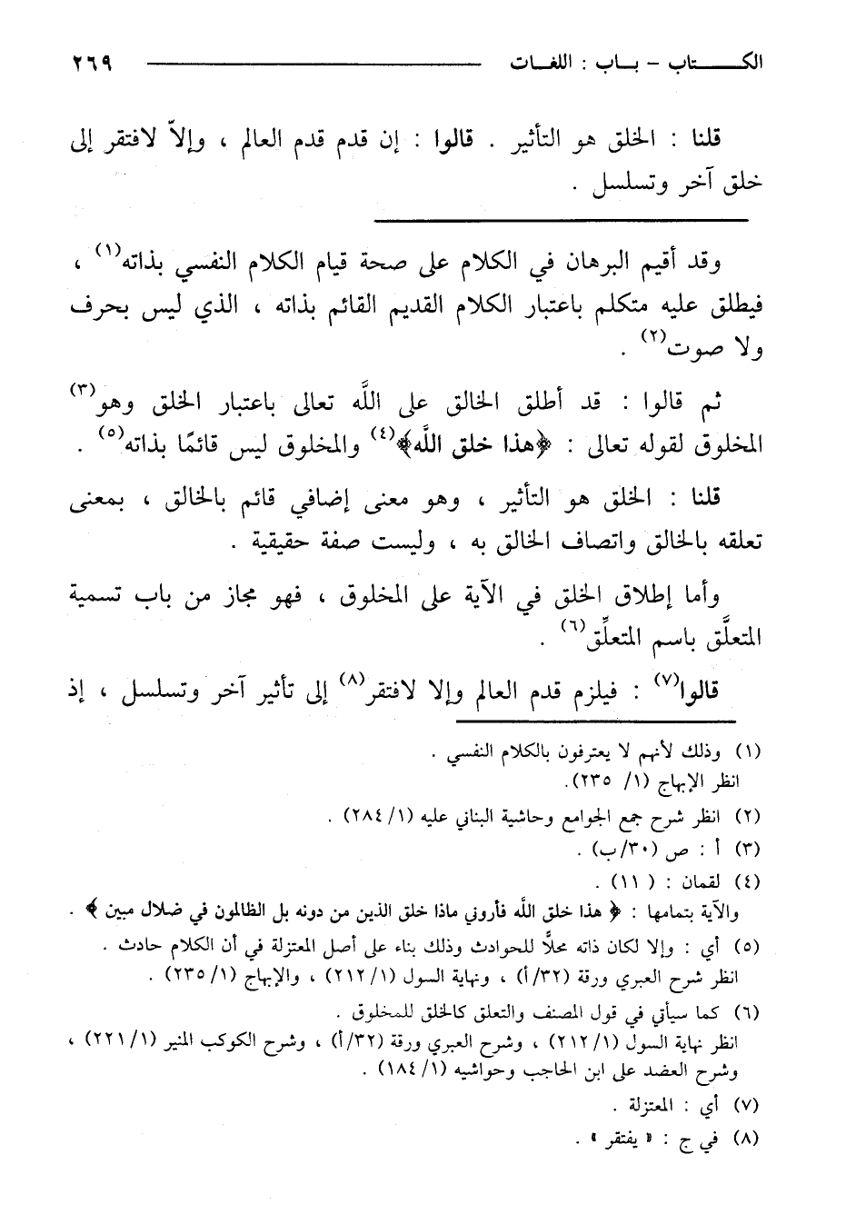 قلنا: الخلق هو التأثير، وهو معنى إضافي قائم بالخالق، بمعنى تعلقه بالخالق واتصاف الخالق به، وليست صفة حقيقية.
