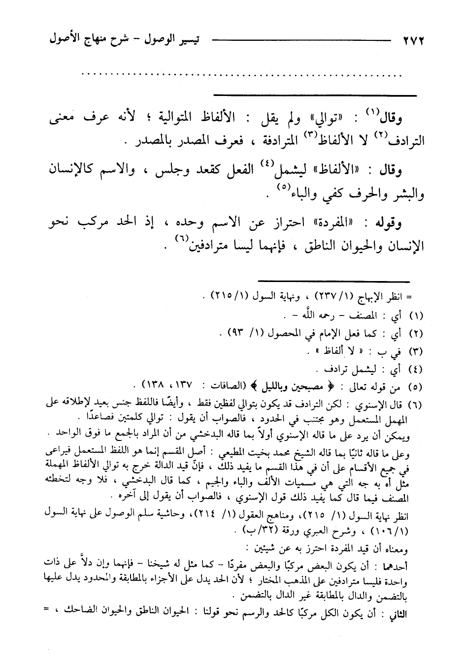 وقوله: ((المفردة)) احتراز عن الاسم وحده، إذ الحد مركب نحو الإنسان والحيوان الناطق، فإنهما ليسا مترادفين.