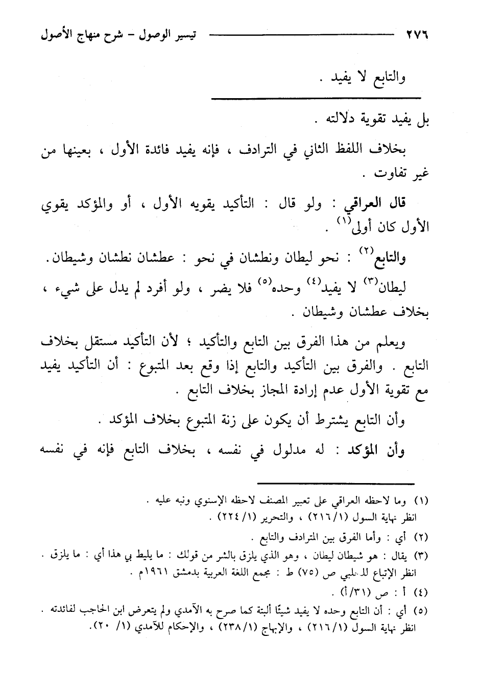 والتابع: نحو ليطان ونطشان في نحو: عطشان نطشان وشيطان. ليطان لا يفيد وحده فلا يضر، ولو أفراد لم يدل على شيء، بخلاف عطشان وشيطان.