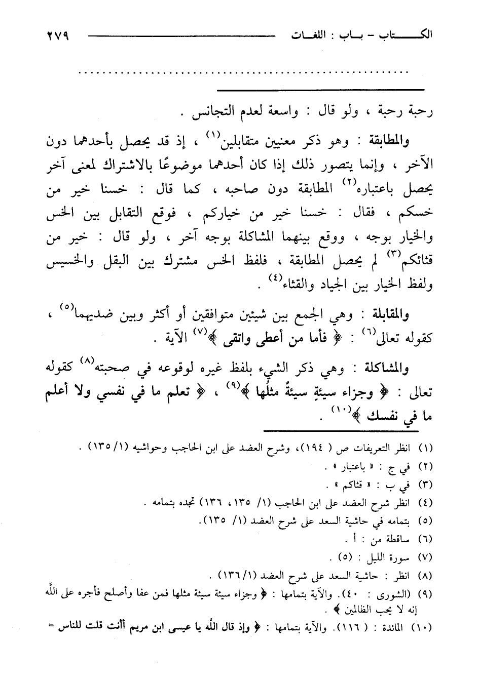 والمقابلة: وهي الجمع بين شيئين متوافقين أو أكثر وبين ضديهما، كقوله تعالى: {فأما من أعطى واتقى} الآية.