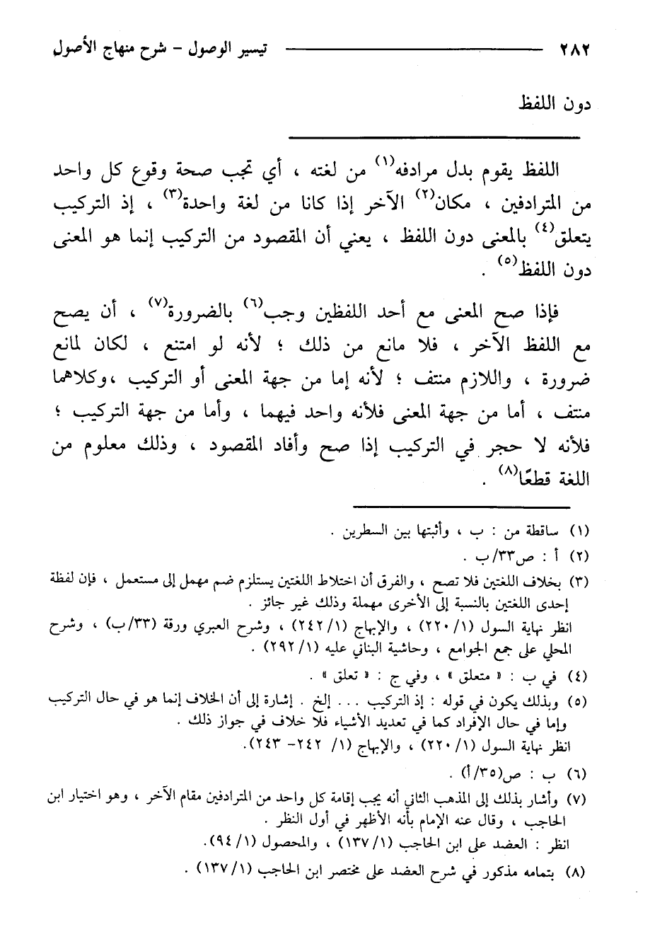 اللفظ يقوم بدل مرادفه من لغته، أي تجب صحة وقوع كل واحد من المترادفين، مكان الآخر إذا كانا من لغة واحدة، إذ التركيب يتعلق بالمعنى دون اللفظ، يعني أن المقصود من التركيب إنما هو المعني دون اللفظ.