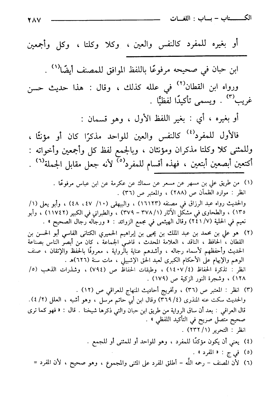 ورواه ابن القطان في علله كذلك، وقال: هذا حديث حسن غريب. ويسمى تأكيدًا لفظيًا.