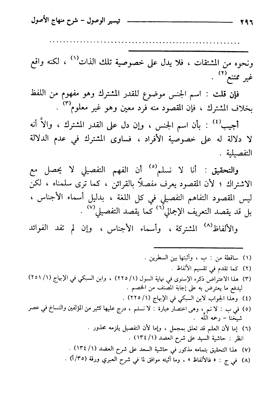 والتحقيق: أنا لا نسلم أن الفهم التفصيلي لا يحصل مع الاشتراك؛ لأن المقصود يعرف مفصلًا بالقرائن، كما ترى سلمناه، لكن ليس المقصود التفاهم التفصيلي في كل اللغة، بدليل أسماء الأجناس، بل قد يقصد التعريف الإجمالي كما يقصد التفصيلي.