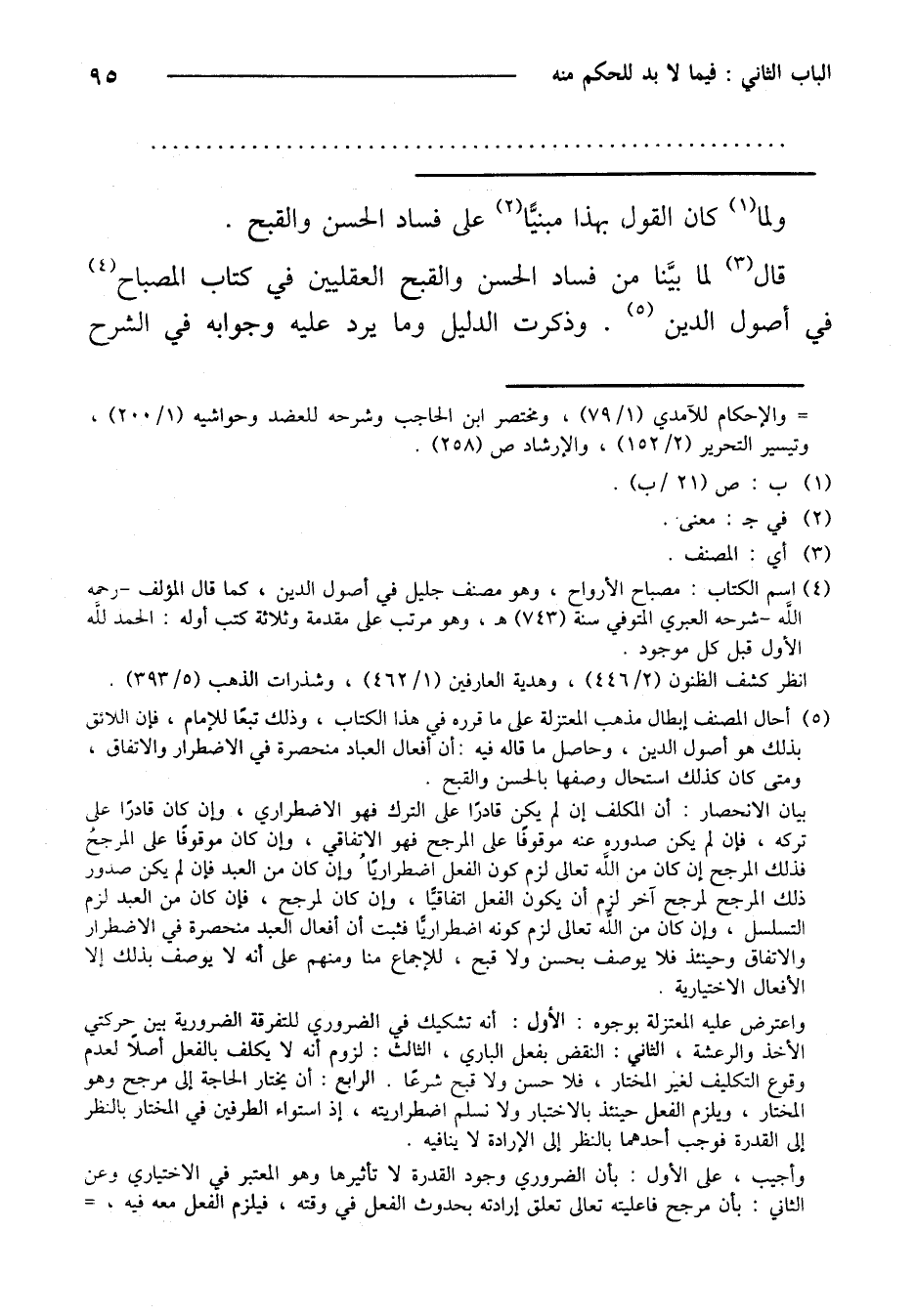 قال لما بينا من فساد الحسن والقبح العقليين في كتاب المصباح في أصول الدين. وذكرت الدليل وما يرد عليه وجوابه في الشرح