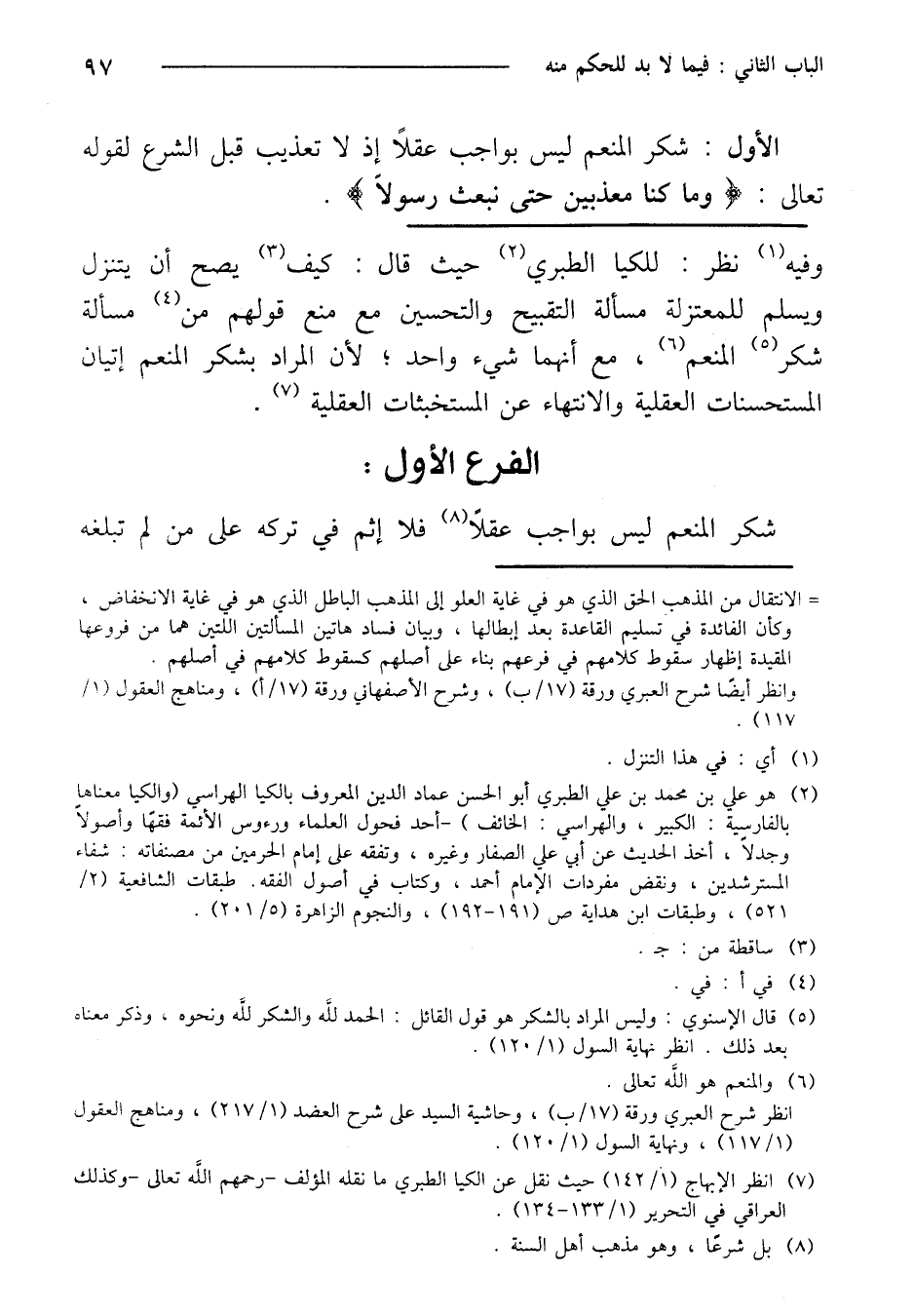 وفيه نظر: للكيا الطبري حيث قال: كيف يصح أن يتنزل ويسلم للمعتزلة مسألة التقبيح والتحسين مع منع قولهم من مسألة شكر المنعم، مع أنهما شيء واحد؛ لأن المراد بشكر المنعم إتيان المستحسنات العقلية والانتهاء عن المستخبثات العقلية.