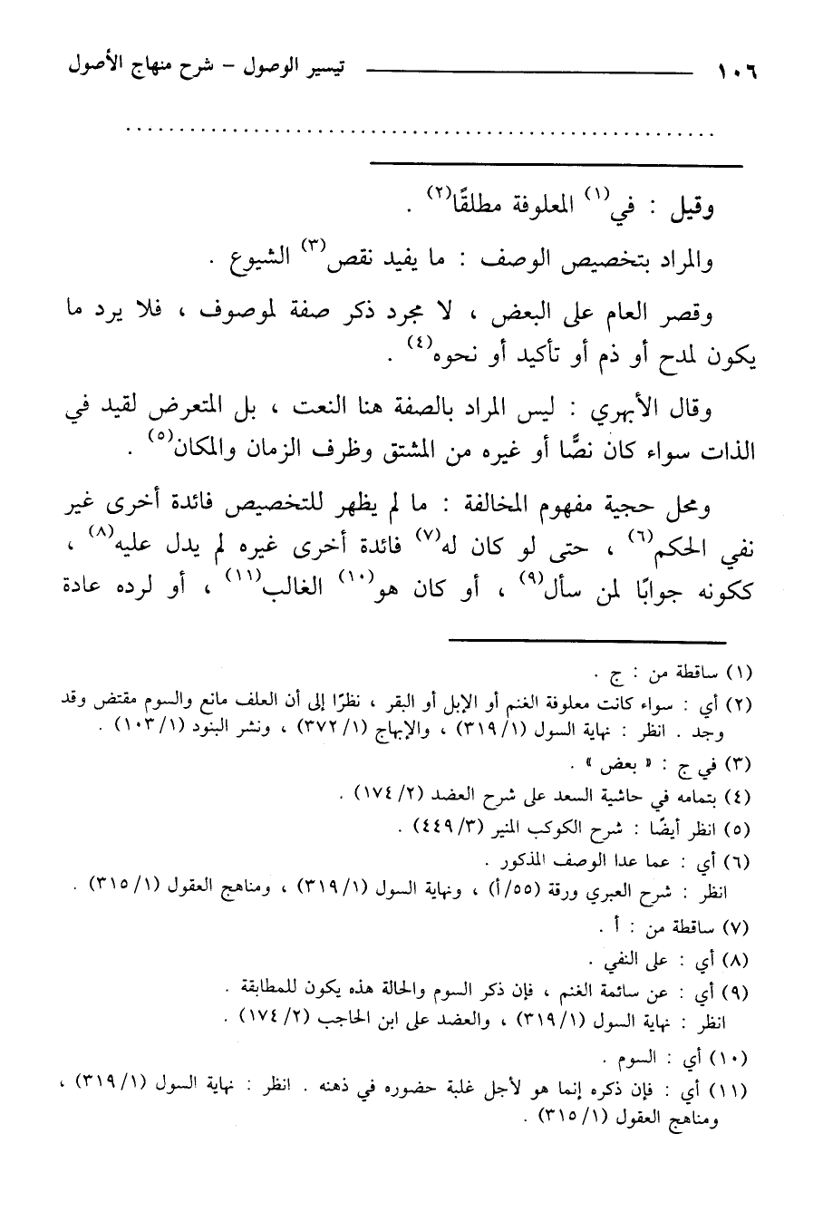 وقال الأبهري: ليس المراد بالصفة هنا النعت، بل المتعرض لقيد في الذات سواء كان نصًا أو غيره من المشتق وظرف الزمان والمكان.