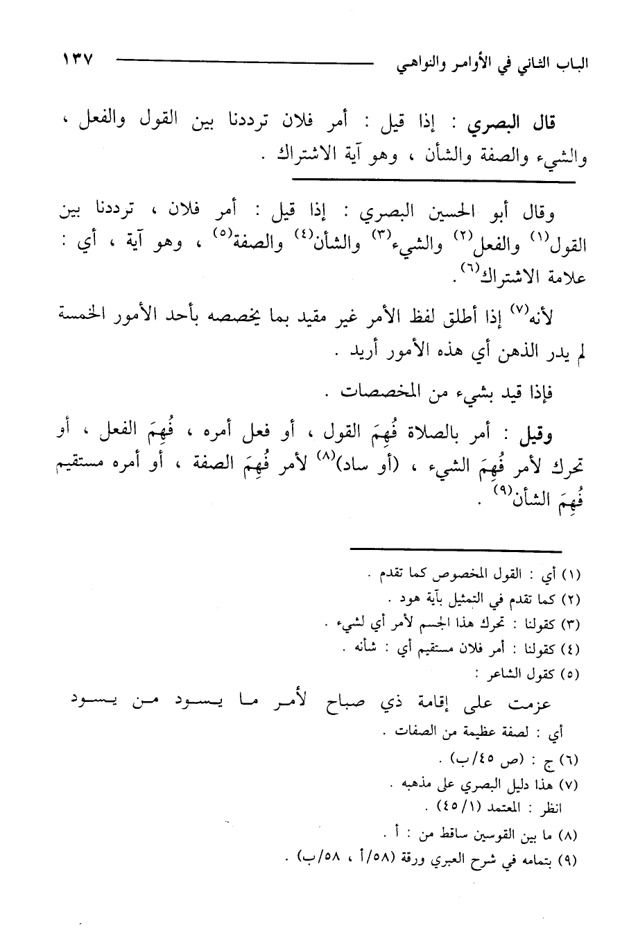 وقال أبو الحسين البصري: إذا قيل: أمر فلان، ترددنا بين القول والفعل والشيء والشأن والصفة، وهو آية، أي: علامة الاشتراك.