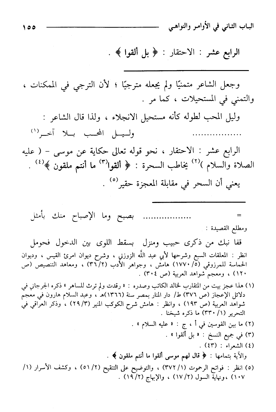 الرابع عشر: الاحتقار، نحو قوله تعالى حكاية عن موسى - (عليه الصلاة والسلام) يخاطب السحرة: } ألقوا ما أنتم ملقون {. يعني أن السحر في مقابلة المعجزة حقير.
