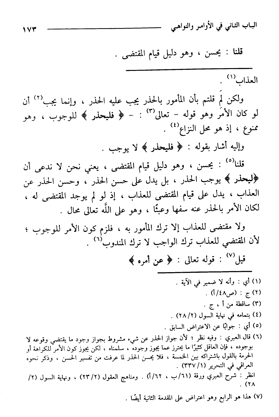 قلنا: يحسن، وهو دليل قيام المقتضى، يعني نحن لا ندعى أن} ليحذر {يوجب الحذر، بل يدل على حسن الحذر، وحسن الحذر عن العذاب، يدل على قيام المقتضى للعذاب، إذ لو لم يوجد المقتضى له، لكان الأمر بالحذر عنه سفها وعبثًا، وهو على الله تعالى محال.