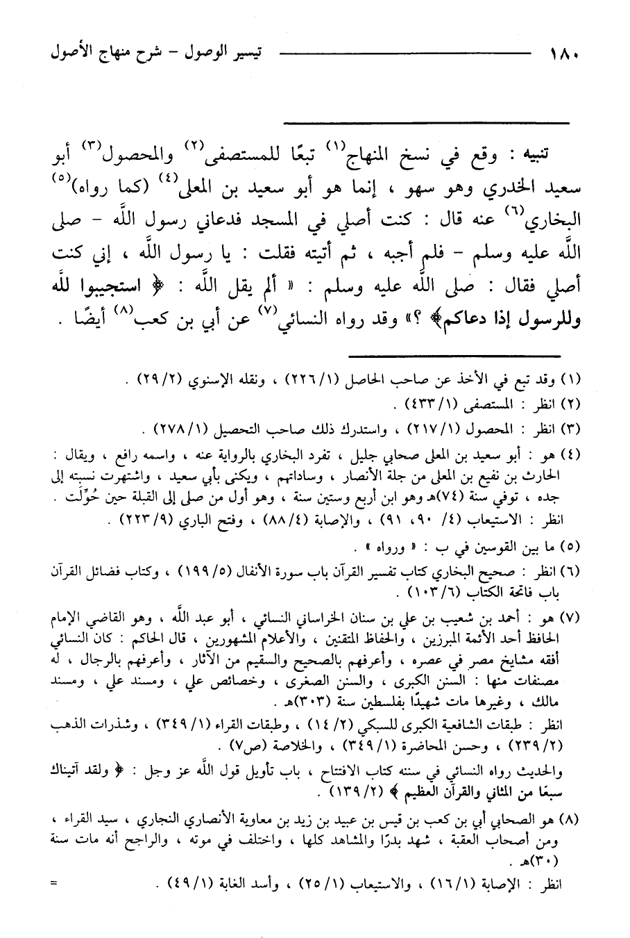 تنبيه: وقع في نسخ المنهاج تبعًا للمستصفى والمحصول أبو سعيد الخدري وهو سهو، إنما هو أبو سعيد بن المعلى (كما رواه) البخاري عنه قال: كنت أصلي في المسجد فدعاني رسول الله - صلى الله عليه وسلم - فلم أجبه، ثم أتيته فقلت: يا رسول الله، إني كنت أصلي فقال: صلى الله عليه وسلم: "ألم يقل الله: } استجيبوا لله وللرسول إذا دعاكم {؟ " وقد رواه النسائي عن أبي بن كعب أيضًا.