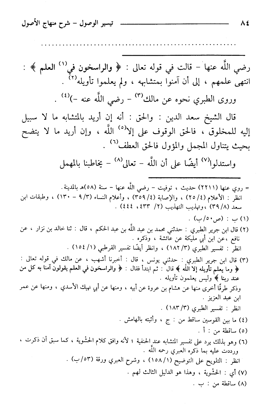 قال الشيخ سعد الدين: والحق: أنه إن أريد بالمتشابه ما لا سبيل إليه للمخلوق، فالحق الوقوف على إلا الله، وإن أريد ما لا يتضح بحيث يتناول المجمل والمؤول فالحق العطف.