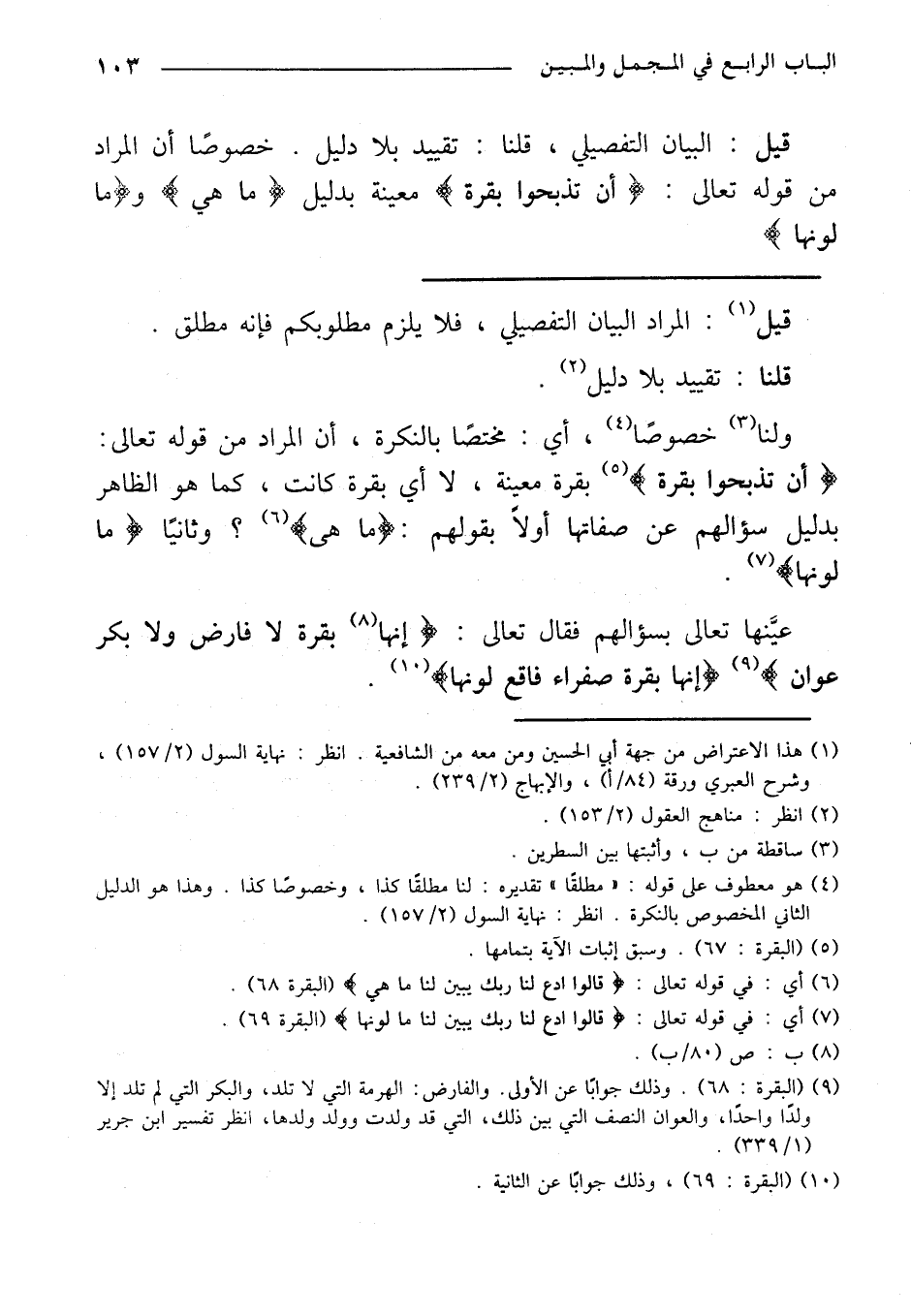 ولنا خصوصًا، أي: مختصًا بالنكرة، أن المراد من قوله تعالى: {أن تذبحوا بقرة} بقرة معينة، لا أي بقرة كانت، كما هو الظاهر بدليل سؤالهم عن صافتها أولًا بقولهم: {ما هي}؟ وثانيًا {ما لونها}.
