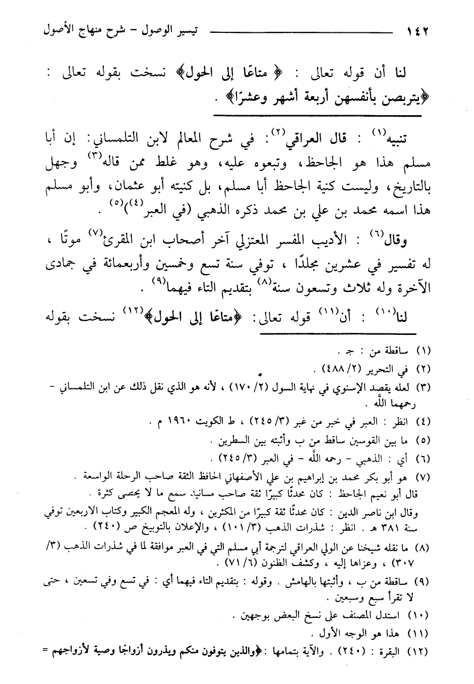 تنبيه: قال العراقي: في شرح المعالم لابن التلمساني: إن أبا مسلم هذا هو الجاحظ، وتبعوه عليه، وهو غلط ممن قاله وجهل بالتاريخ، وليست كنية الجاحظ أبا مسلم، بل كنيته أبو عثمان، وأبو مسلم هذا اسمه محمد بن علي بن محمد ذكره الذهبي (في العبر).