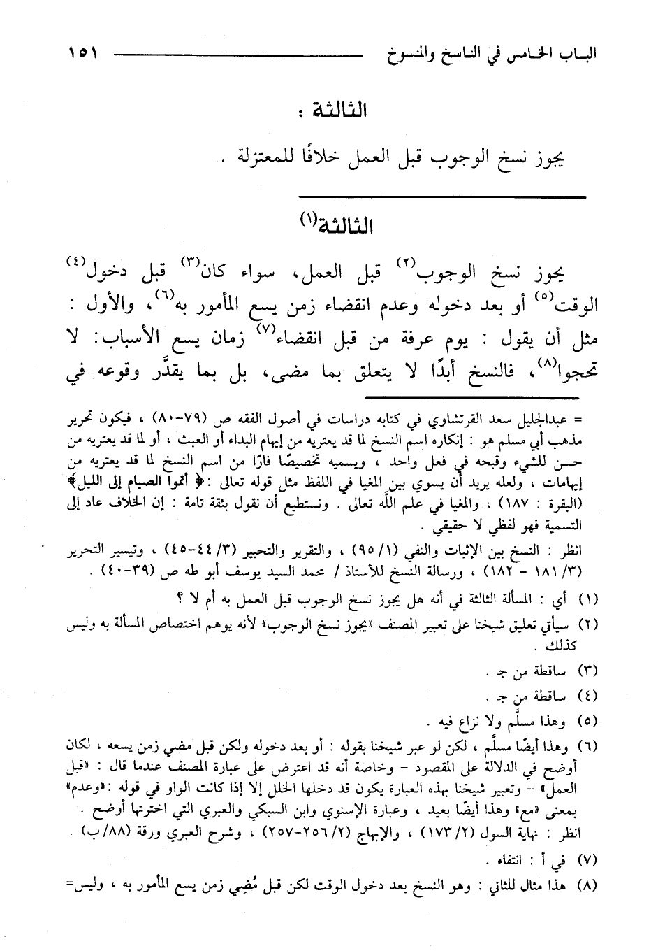 يحوز نسخ الوجوب قبل العمل، سواء كان قبل دخول الوقت أو بعد دخوله وعدم انقضاء زمن يسع المأمور به، والأول: مثل أن يقول: يوم عرفة من قبل انقضاء زمان يسع الأسباب: لا تحجوا، فالنسخ أبدًا لا يتعلق بما مضى، بل بما يقدر وقوعه في