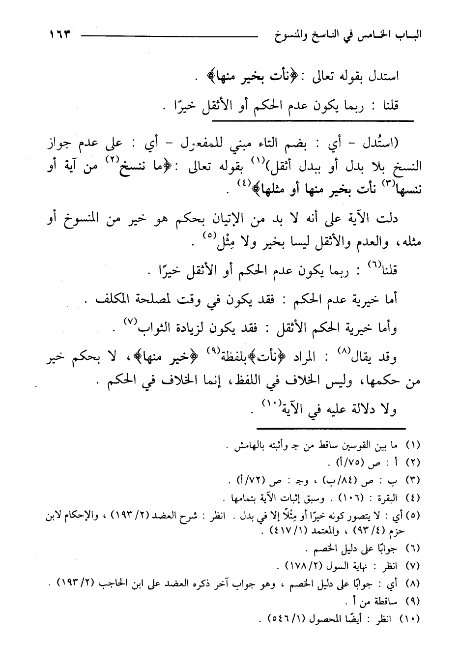 دلت الآية على أنه لا بد من الإتيان بحكم هو خير من المنسوخ أو مثله، والعدم والأثقل ليسا بخير ولا مثل.