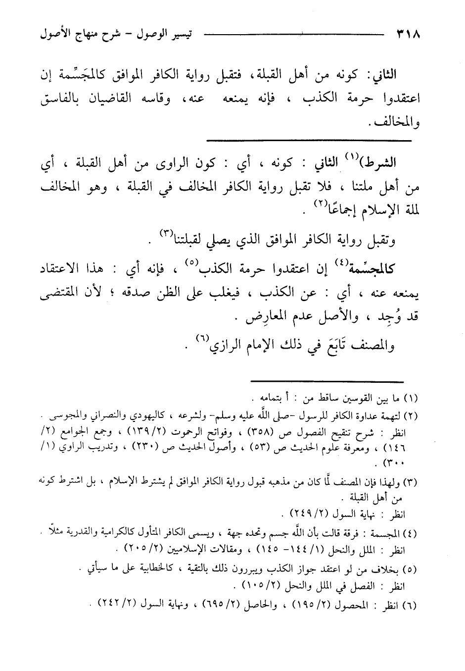 الشرط) الثاني: كونه، أي: كون الراوي من أهل القبلة، أي من أهل ملتنا، فلا تقبل رواية الكافر المخالف في القبلة، وهو المخالف لملة الإسلام إجماعًا.