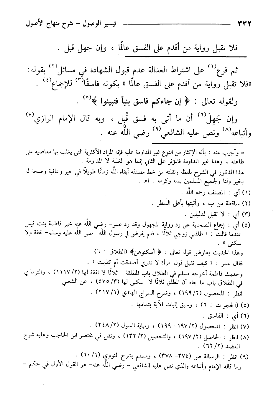 ثم فرع على اشتراط العدالة عدم قبول الشهادة في مسائل بقوله: «فلا تقبل رواية من أقدم على الفسق عالمًا» بكونه فاسقًا للإجماع.