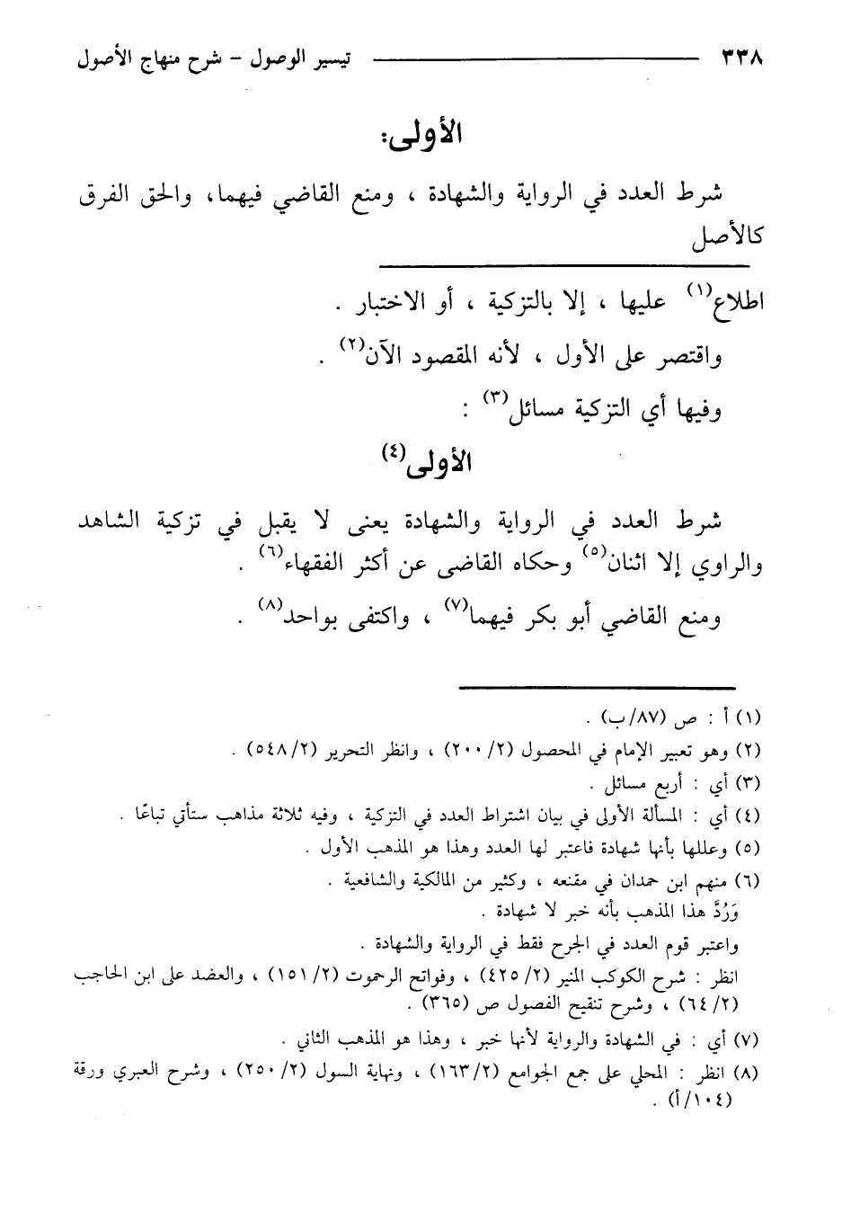 شرط العدد في الرواية والشهادة يعني لا يقبل في تزكية الشاهد والراوي إلا اثنان حكاه القاضي عن أكثر الفقهاء.