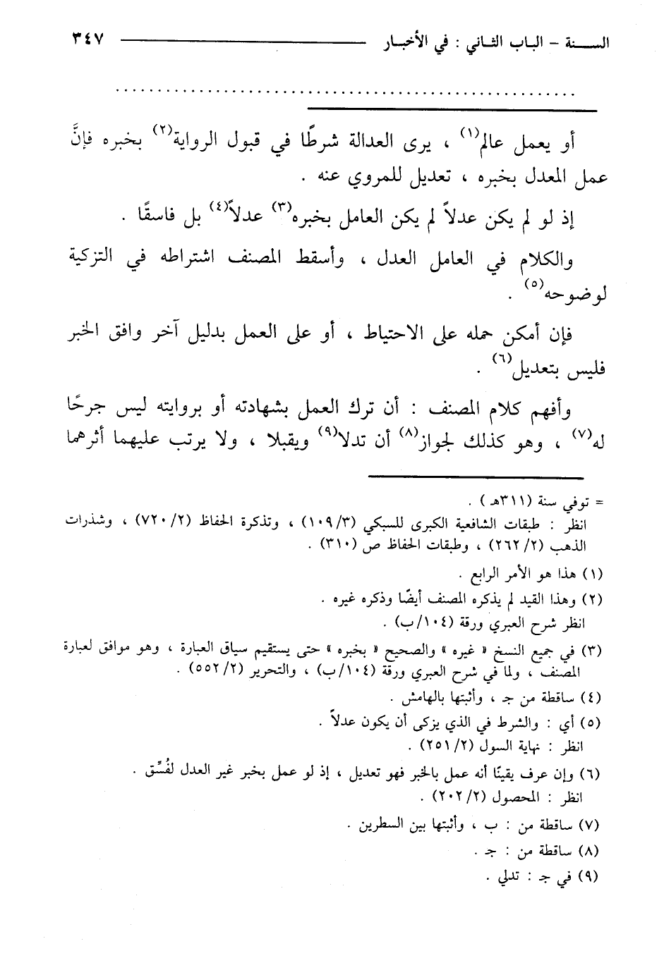 أو يعمل عالم، يرى العدالة شرطًا في قبول الرواية بخبره فإن عمل المعدل بخبره، تعديل للمروي عنه.