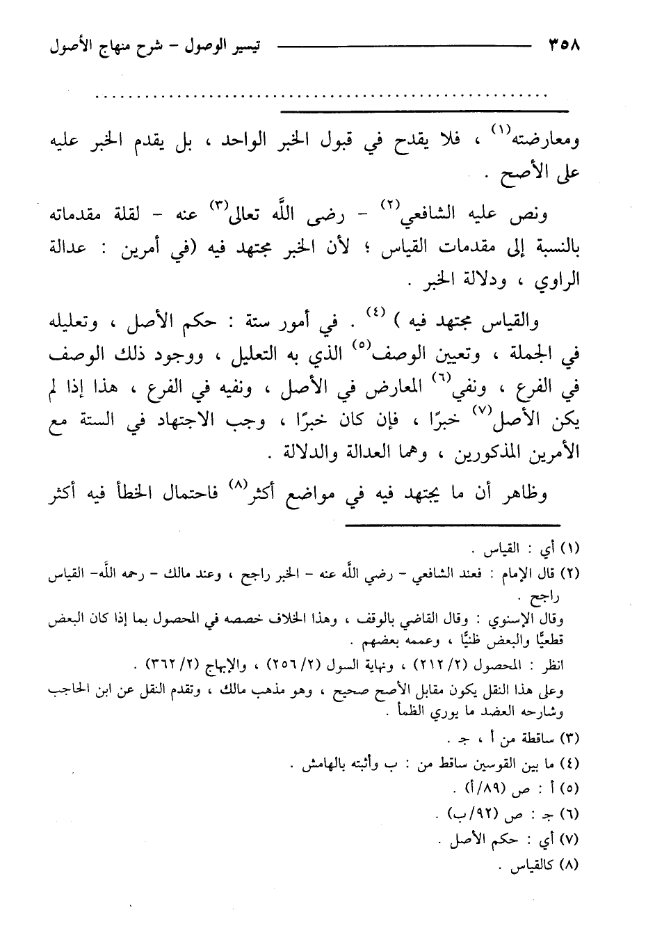والقياس مجتهد فيه). في أمور ستة: حكم الأصل، وتعليله في الجملة، وتعيين الوصف الذي به التعليل، ووجود ذلك الوصف في الفرع، ونفي المعارض في الأصل، ونفيه في الفرع، هذا إذا لم يكن الأصل خبرًا، فإن كان خبرًا، وجب الاجتهاد في الستة مع الأمرين المذكورين، وهما العدالة والدلالة.