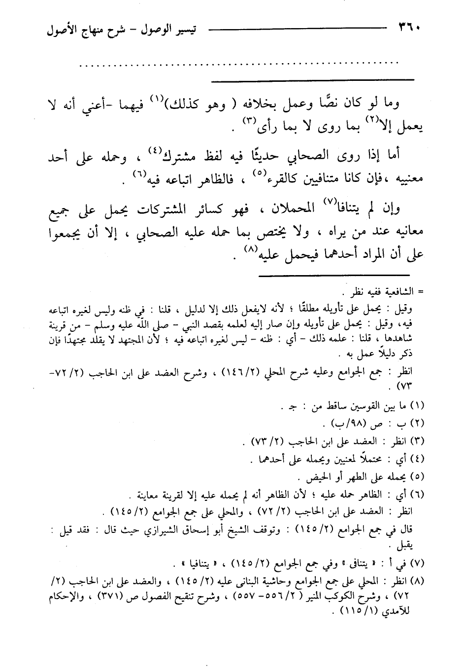وإن لم يتنافا المحملان، فهو كسائر المشتركات يحمل على جميع معانيه عند من يراه، ولا يختص بما حمله عليه الصحابي، إلا أن يجمعوا على أن المراد أحدهما فيحمل عليه.