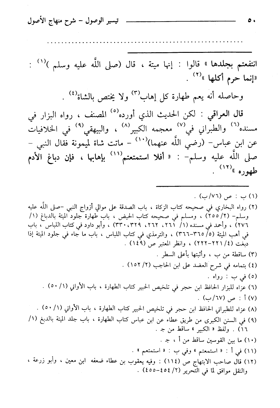 قال العراقي: لكن الحديث الذي أورده المصنف، رواه البزار في مسنده والطبراني في معجمه الكبير، والبيهقي في الخلافيات عن ابن عباس - (رضي الله عنهما) -ماتت شاة لميمونة فقال النبي -صلى الله عليه وسلم -: «أفلا استمتعتم بإهابها، فإن دباغ الأدم طهوره».
