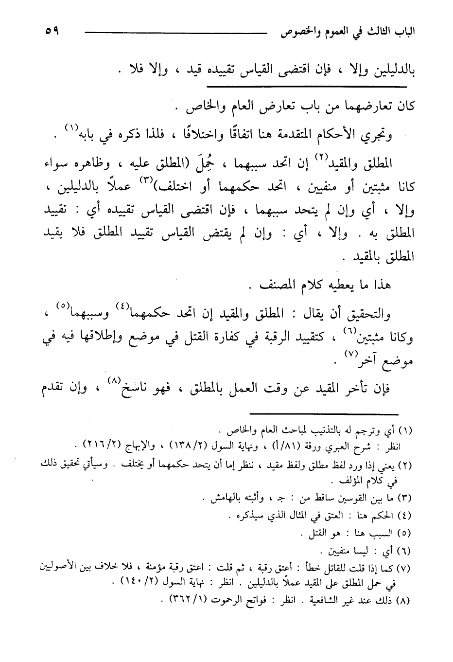 المطلق والمقيد إن اتحد سببهما، حمل (المطلق عليه، وظاهره سواء كانا مثبتين أو منفيين، اتحد حكمهما أو اختلف) عملًا بالدليلين، وإلا، أي وإن لم يتحد سببهما، فإن اقتضى القياس تقييده أي: تقييد المطلق به. وإلا، أي: وإن لم يقتض القياس تقييد المطلق فلا يقيد المطلق بالمقيد.