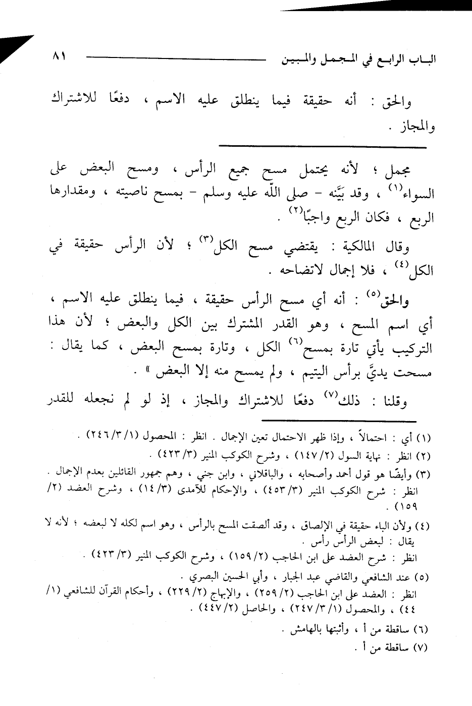 والحق: أنه أي مسح الرأس حقيقة، فيما ينطلق عليه الاسم، أي اسم المسح، وهو القدر المشترك بين الكل والبعض؛ لأن هذا التركيب يأتي تارة بمسح الكل، وتارة بمسح البعض، كما يقال: مسحت يدي برأس اليتيم، ولم يمسح منه إلا البعض».