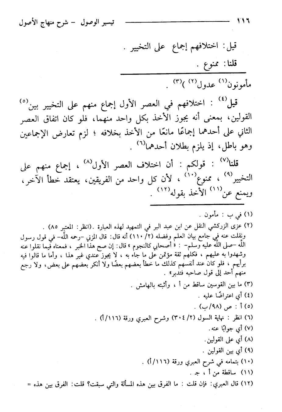 قلنا: قولكم: أن اختلاف العصر الأول، إجماع منهم على التخيير، ممنوع، لأن كل واحد من الفريقين، يعتقد خطأ الآخر، ويمنع عن الأخذ بقوله.