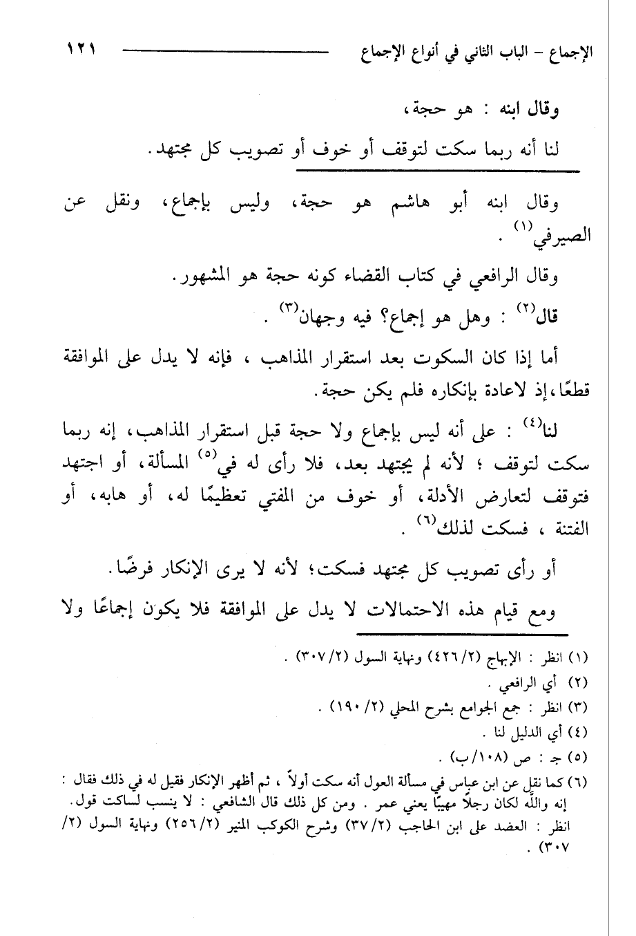 لنا: على أنه ليس بإجماع ولا حجة قبل استقرار المذاهب، إنه ربما سكت لتوقف؛ لأنه لم يجتهد بعد، فلا رأي له في المسألة، أو اجتهد فتوقف لتعارض الأدلة، أو خوف من المفتي تعظيمًا له، أو هابه، أو الفتنة، فسكت لذلك.