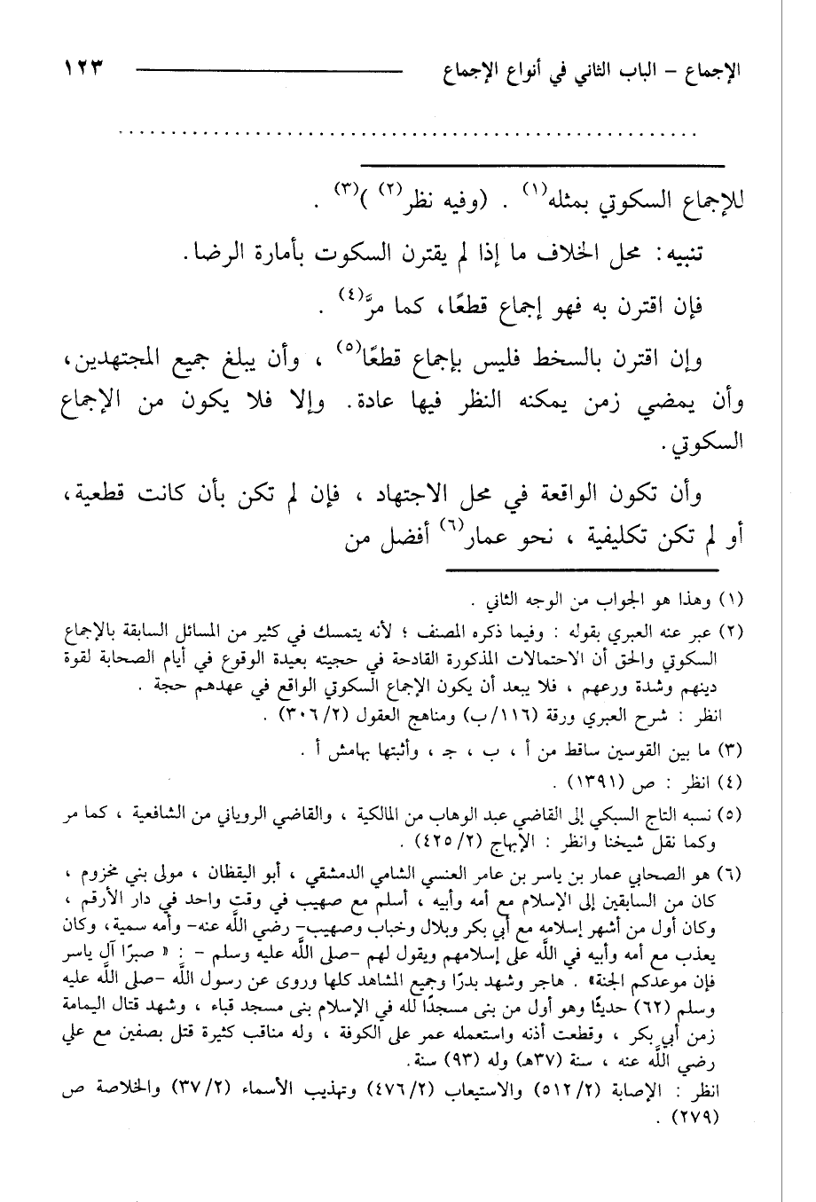 وإن اقترن بالسخط فليس بإجماع قطعًا، وأن يبلغ جميع المجتهدين، وأن يمضي زمن يمكنه النظر فيها عادة. وإلا فلا يكون من الإجماع السكوتي.