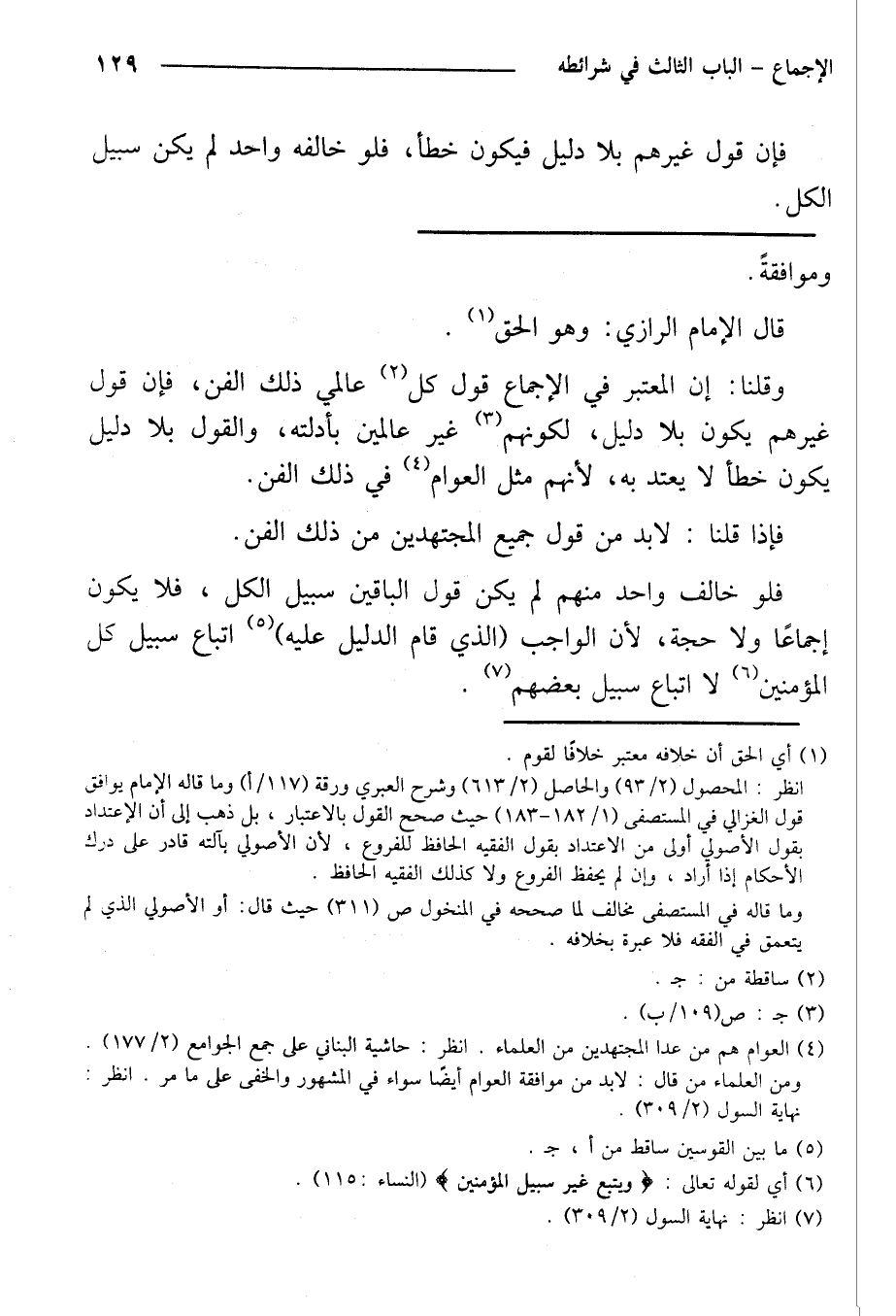 فلو خالف واحد منهم لم يكن قول الباقين سبيل الكل، فلا يكون إجماعًا ولا حجة، لأن الواجب (الذي قام الدليل عليه) إتباع سبيل كل المؤمنين لا إتباع سبيل بعضهم.