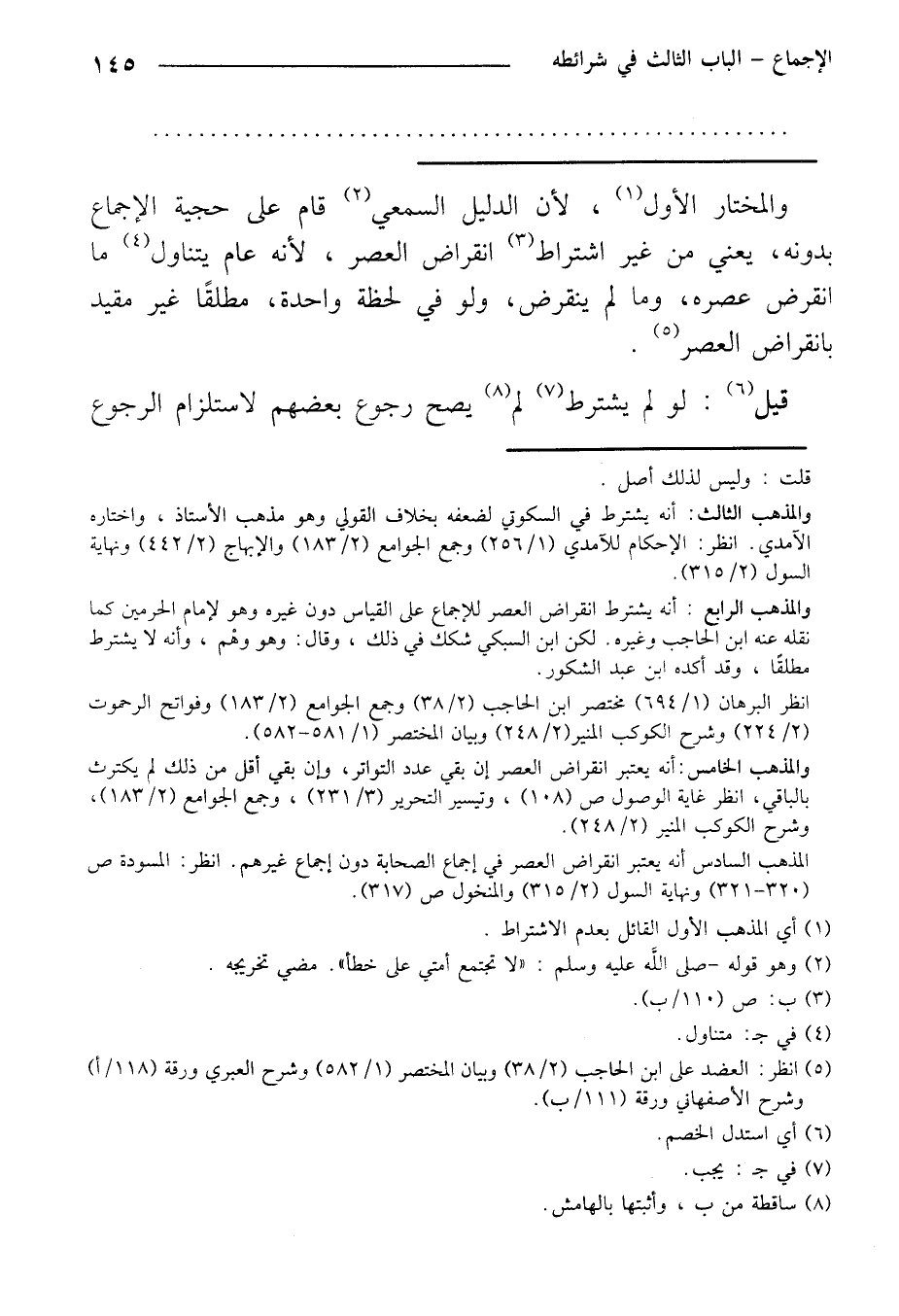 والمختار الأول، لأن الدليل السمعي قام على حجية الإجماع بدونه، يعني من غير اشتراط انقراض العصر، لأنه عام يتناول ما انقرض عصره، وما لم ينقرض، ولو في لحظة واحدة، مطلقًا غير مقيد بانقراض العصر.