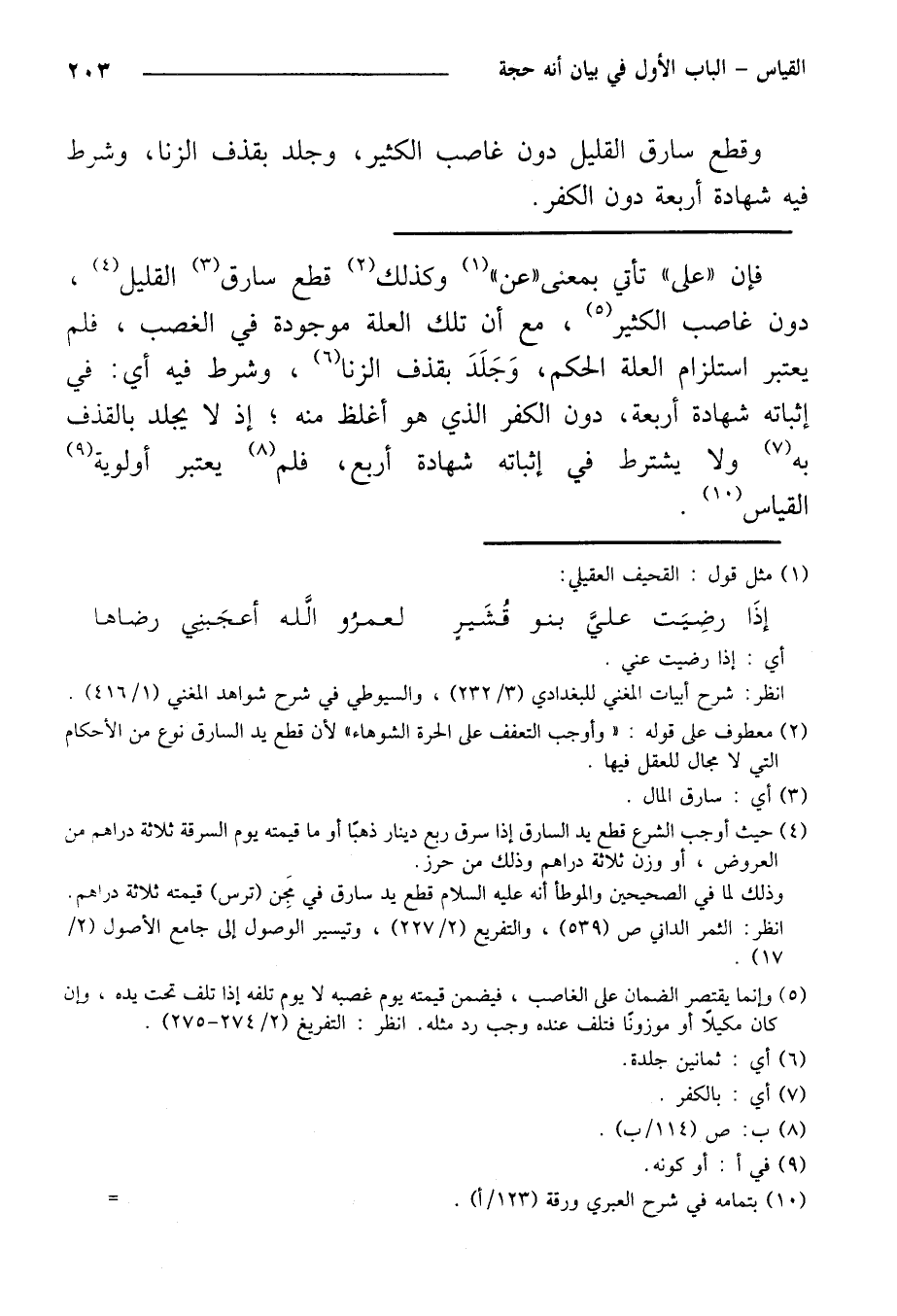 فإن "على" تأتي بمعنى "عن" وكذلك قطع سارق القليل، دون غاصب الكثير، مع أن تلك العلة موجودة في الغصب، فلم يعتبر استلزام العلة الحكم، وجلد بقذف الزنا، وشرط فيه أي: في إثباته شهادة أربعة، دون الكفر الذي هو أغلظ منه؛ إذ لا يجلد بالقذف به ولا يشترط في إثباته شهادة أربع، فلم يعتبر أولوية القياس.
