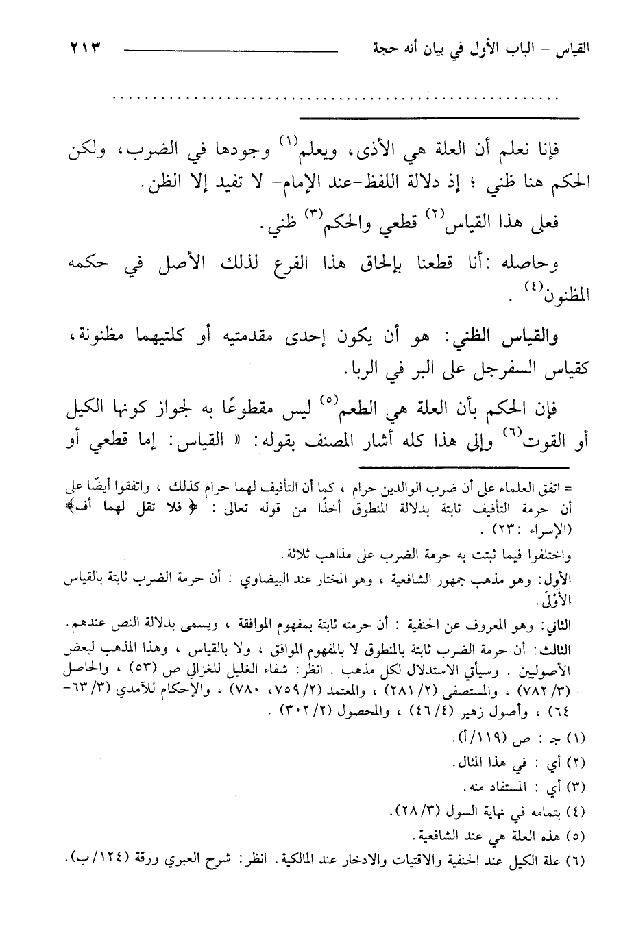 فإنا نعلم أن العلة هي الأذى، ويعلم وجودها في الضرب، ولكن الحكم هنا ظني؛ إذ دلالة اللفظ -عند الإمام- لا تفيد إلا الظن.