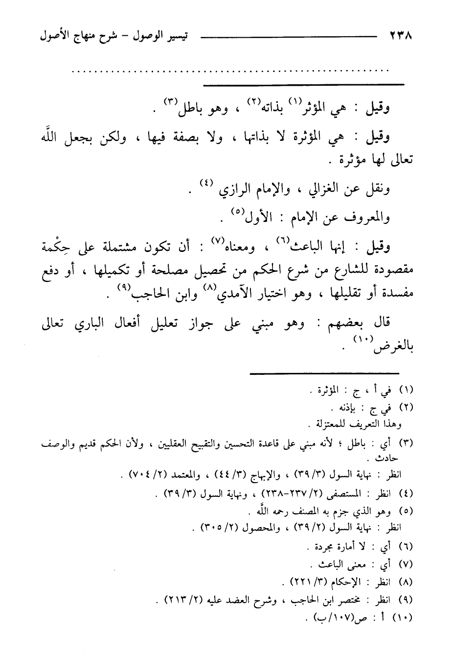 وقيل: إنها الباعث، ومعناه: أن تكون مشتملة على حكمة مقصودة للشارع من شرع الحكم من تحصيل مصلحة أو تكميلها، أو دفع مفسدة أو تقليلها، وهو اختيار الآمدي وابن الحاجب.