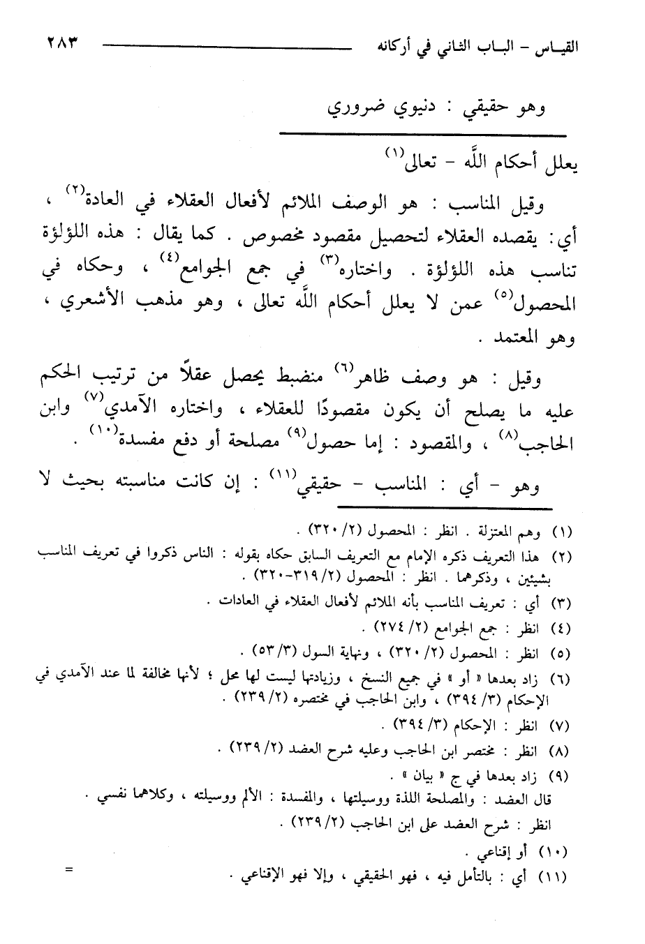 وقيل المناسب: هو الوصف الملائم لأفعال العقلاء في العادة، أي: يقصده العقلاء لتحصيل مقصود مخصوص. كما يقال: هذه اللؤلؤة تناسب هذه اللؤلؤة. واختاره في جمع الجوامع، وحكاه في المحصول عمن لا يعلل أحكام الله تعالى، وهو مذهب الأشعري، وهو المعتمد.