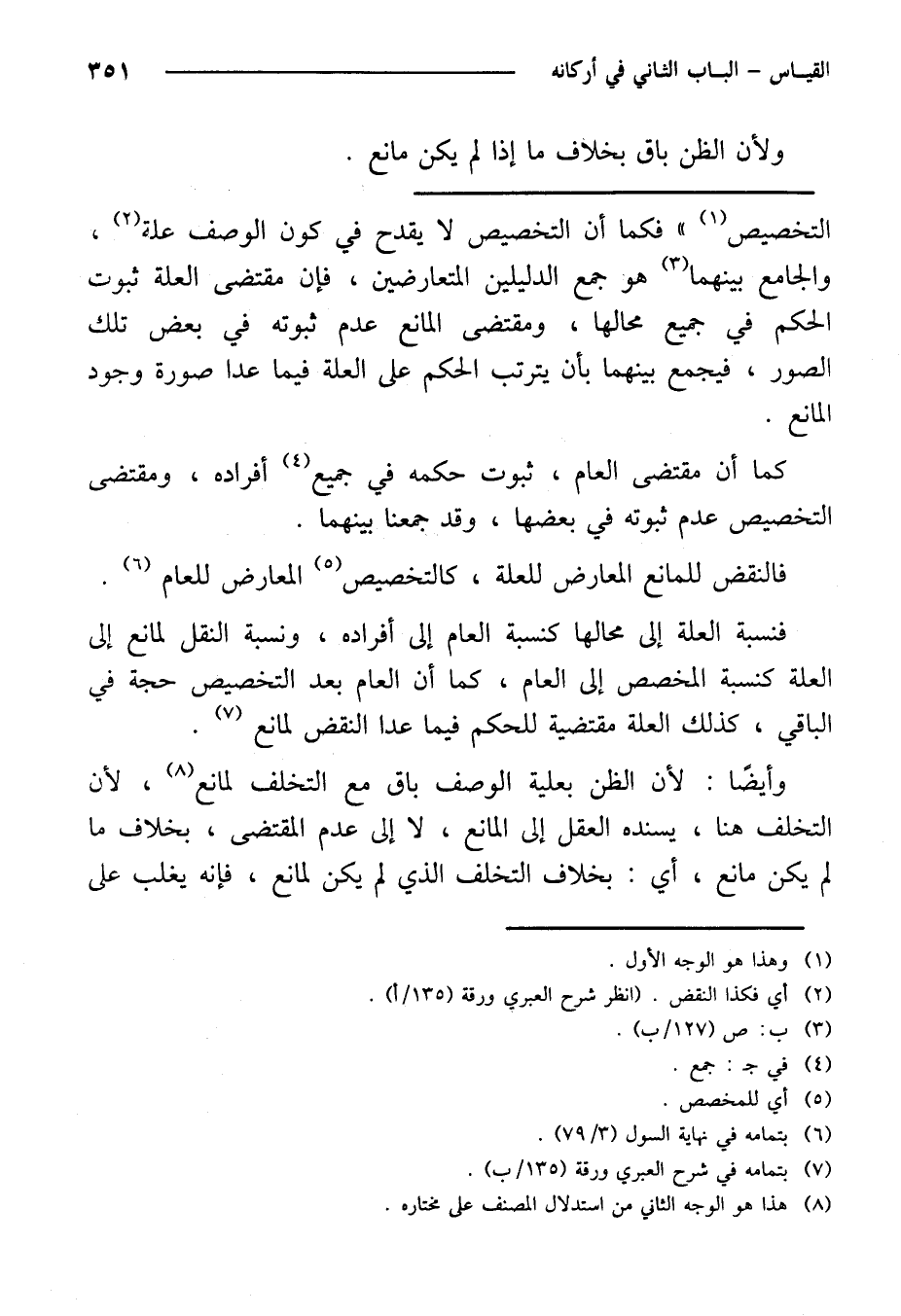 فنسبة العلة إلى محالها كنسبة العام إلى أفراده، ونسبة النقل لمانع إلى العلة كنسبة المخصص إلى العام، كما أن العام بعد التخصيص حجة في الباقي، كذلك العلة مقتضية للحكم فيما عدا النقض لمانع.