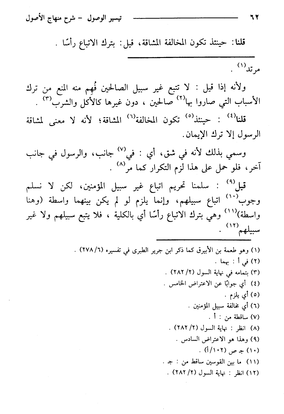 قيل: سلمنا تحريم إتباع غير سبيل المؤمنين، لكن لا نسلم وجوب إتباع سبيلهم، وإنما يلزم لو لم يكن بينهما واسطة (وهنا واسطة) وهي بترك الإتباع رأسًا أي بالكلية، فلا يتبع سبيلهم ولا غير سبيلهم.