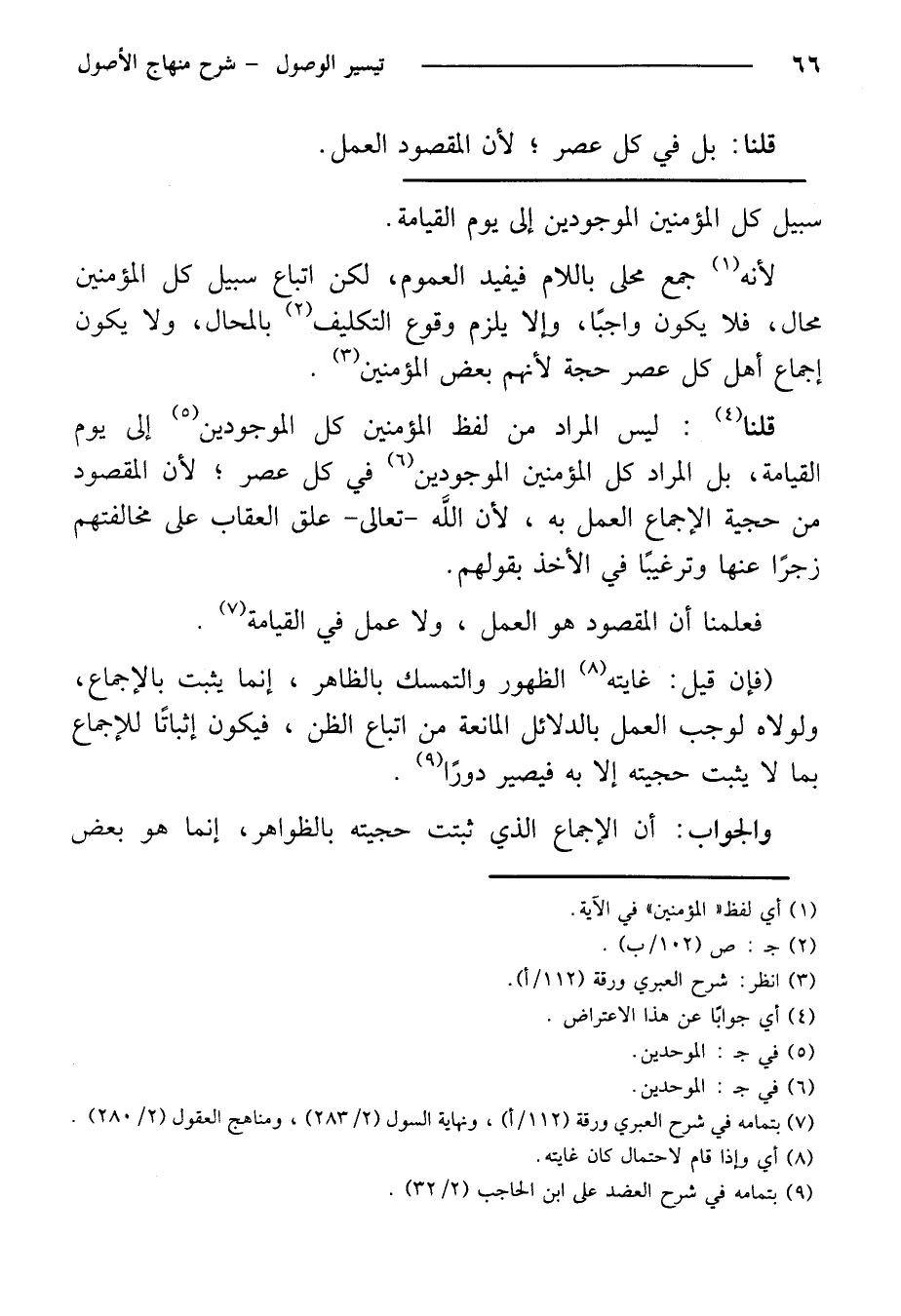 قلنا: ليس المراد من لفظ المؤمنين كل الموجودين إلى يوم القيامة، بل المراد كل المؤمنين الموجودين في كل عصر؛ لأن المقصود من حجية الإجماع العمل به، لأن الله -تعالى- علق العقاب على مخالفتهم زجرًا عنها وترغيبًا في الأخذ بقولهم.