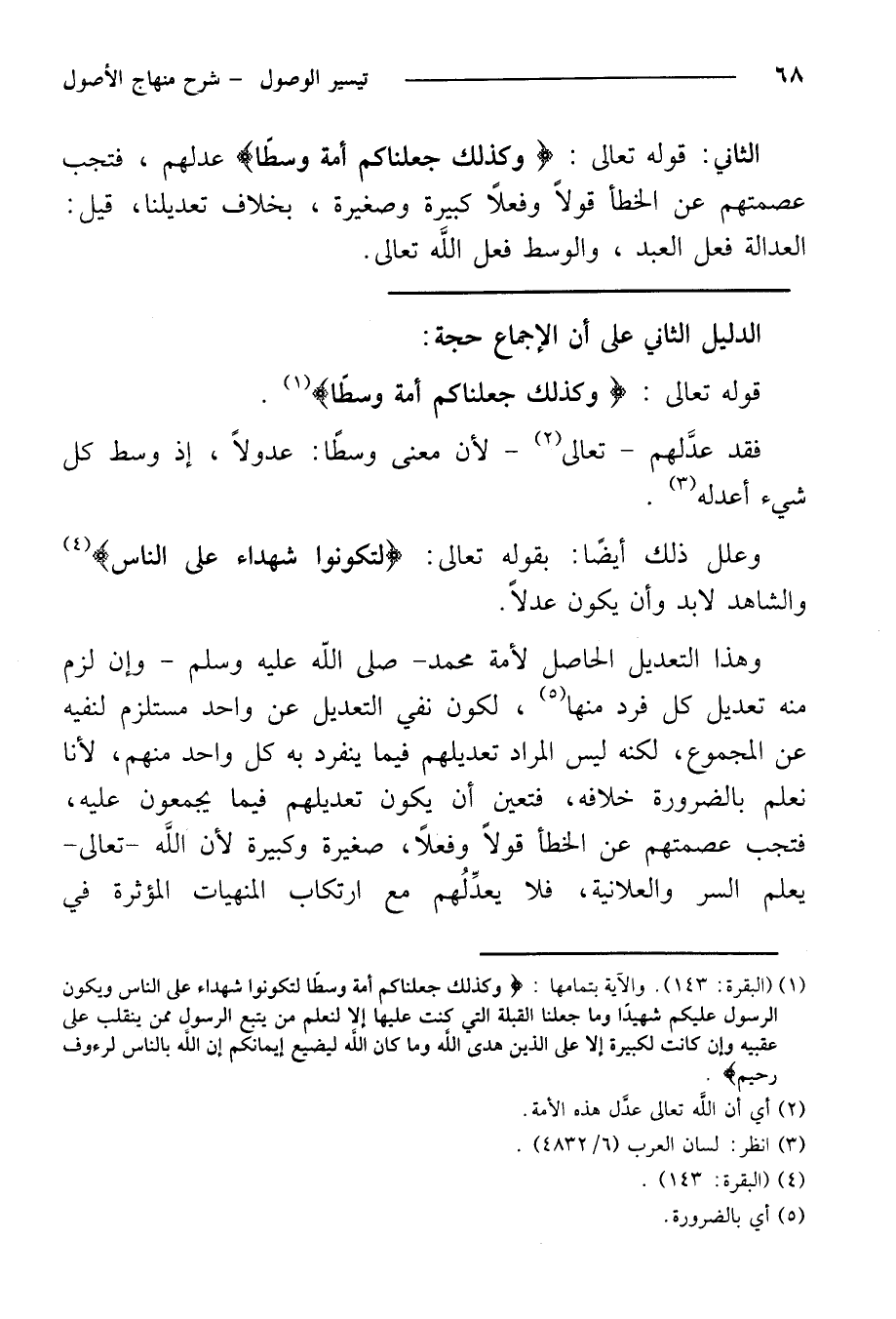 وهذا التعديل الحاصل لأمة محمد -صلى الله عليه وسلم- وإن لزم منه تعديل كل فرد منها، لكون نفي التعديل عن واحد مستلزم لنفيه عن المجموع، لكنه ليس المراد تعديلهم فيما ينفرد به كل واحد منهم، لأنا نعلم بالضرورة خلافه، فتعين أن يكون تعديلهم فيما يجمعون عليه، فتجب عصمتهم عن الخطأ قولًا وفعلًا، صغيرة وكبيرة لأن الله -تعالى- يعلم السر والعلانية، فلا يعدلهم مع ارتكاب المنهيات المؤثرة في