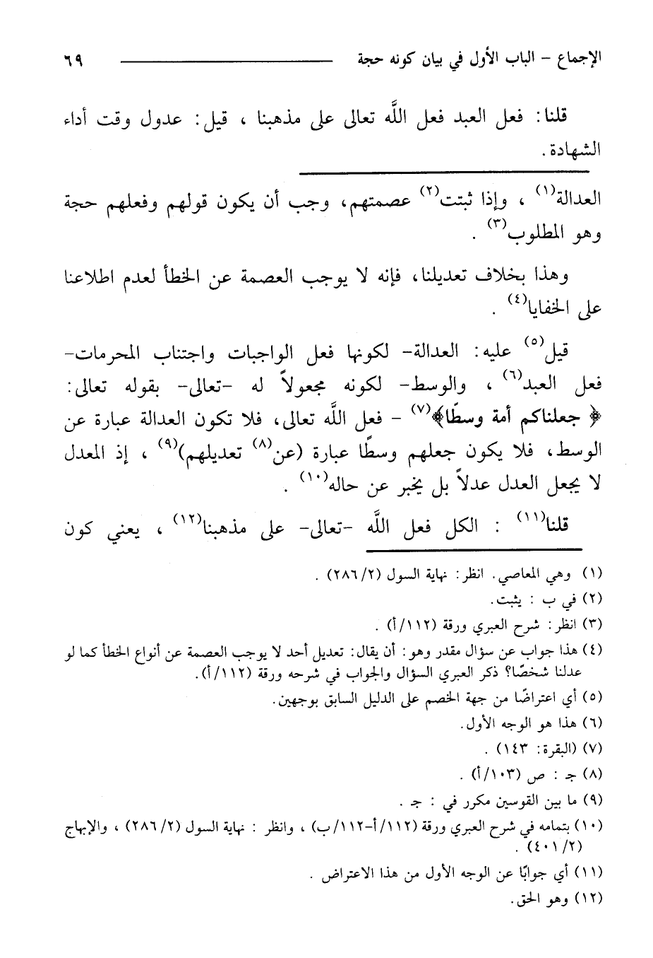 قيل عليه: العدالة -لكونها فعل الواجبات واجتناب المحرمات- فعل العبد، والوسط -لكونه مجعولًا له -تعالى- بقوله تعالى: {جعلناكم أمة وسطا} - فعل الله تعالى، فلا تكون العدالة عبارة عن الوسط، فلا يكون جعلهم وسطًا عبارة (عن تعديلهم)، إذ المعدل لا يجعل العدل عدلًا بل يخبر عن حاله.