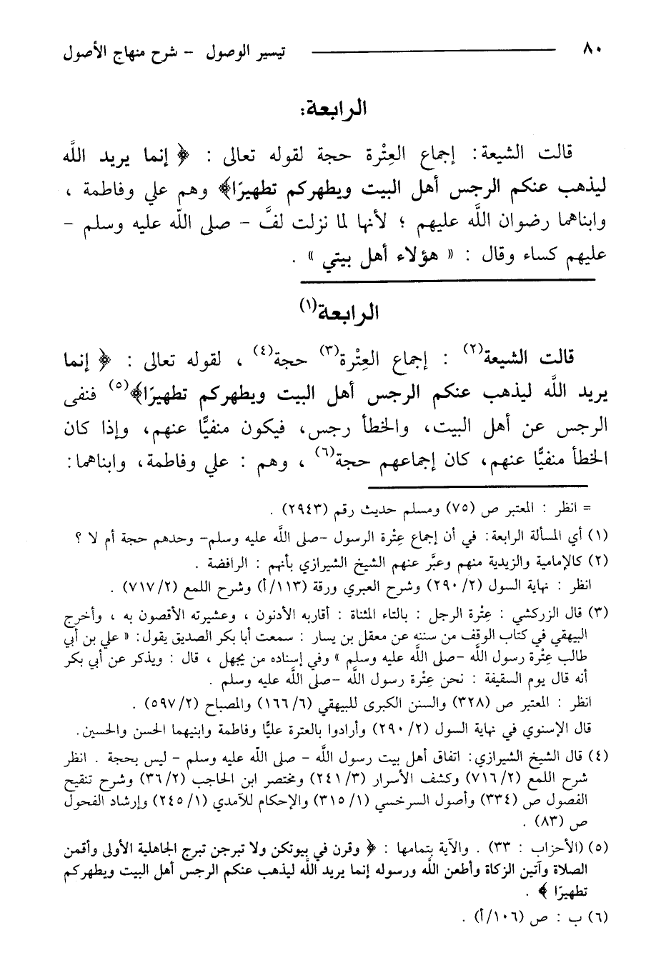 قالت الشيعة: إجماع العترة حجة، لقوله تعالى: {إنما يريد الله ليذهب عنكم الرجس أهل البيت ويطهركم تطهيرًا} فنفى الرجس عن أهل البيت، والخطأ رجس، فيكون منفيًا عنهم، وإذا كان الخطأ منفيًا عنهم، كان بإجماعهم حجة، وهم: علي وفاطمة، وابناهما: