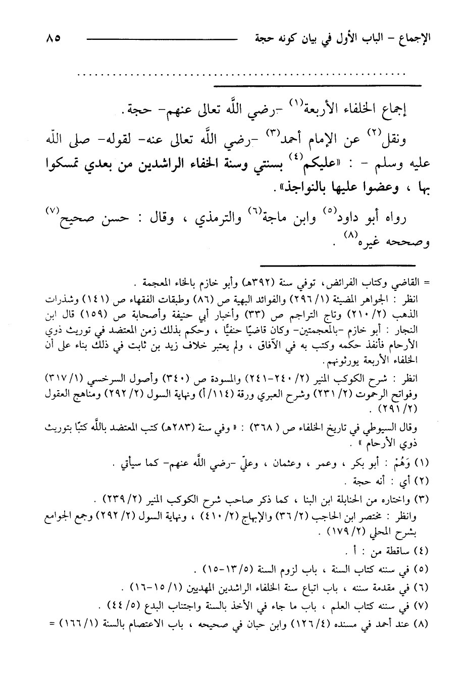 ونقل عن الإمام أحمد -رضي الله تعالى عنه- لقوله -صلى الله عليه وسلم-: «عليكم بسنتي وسنة الخلفاء الراشدين من بعدي تمسكوا بها، وعضوا عليها بالنواجذ».