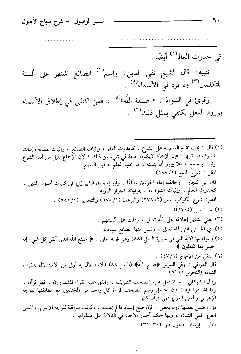 تنبيه: قال الشيخ تقي الدين واسم الصانع اشتهر على ألسنة المتكلمين ولم يرد في الأسماء.