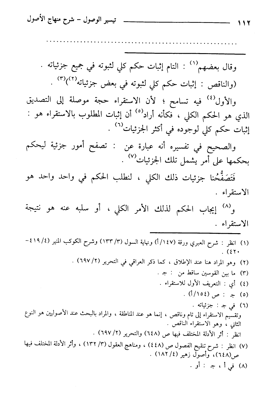 فتصفحنا جزئيات ذلك الكلي، لنطلب الحكم في واحد واحد هو الاستقراء. وإيجاب الحكم لذلك الأمر الكلي، أو سلبه عنه هو نتيجة الاستقراء.