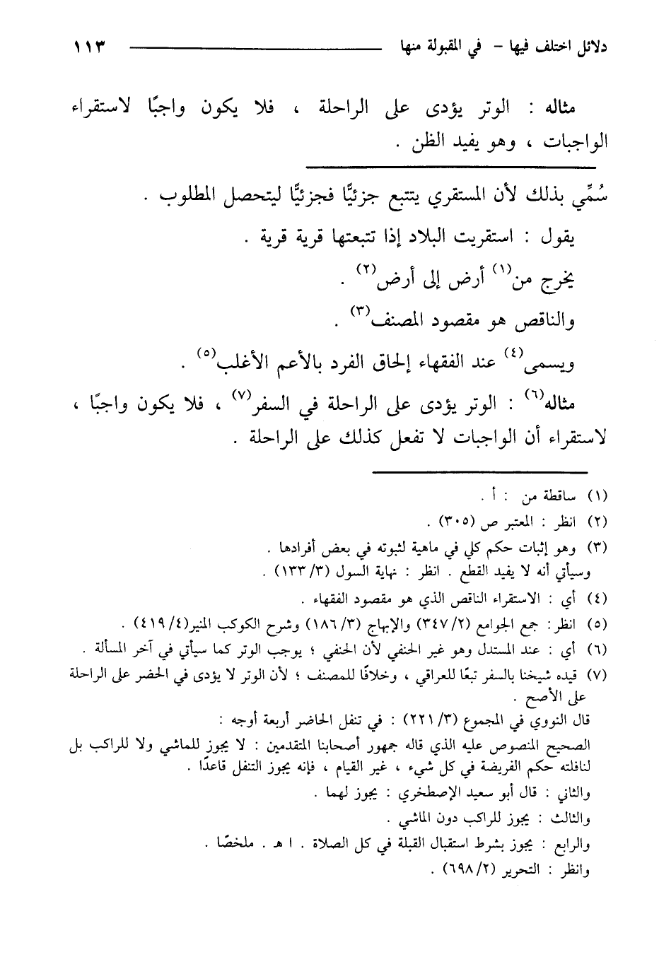مثاله: الوتر يؤدى على الراحلة في السفر، فلا يكون واجبًا، لاستقراء أن الواجبات لا تفعل كذلك على الراحلة.
